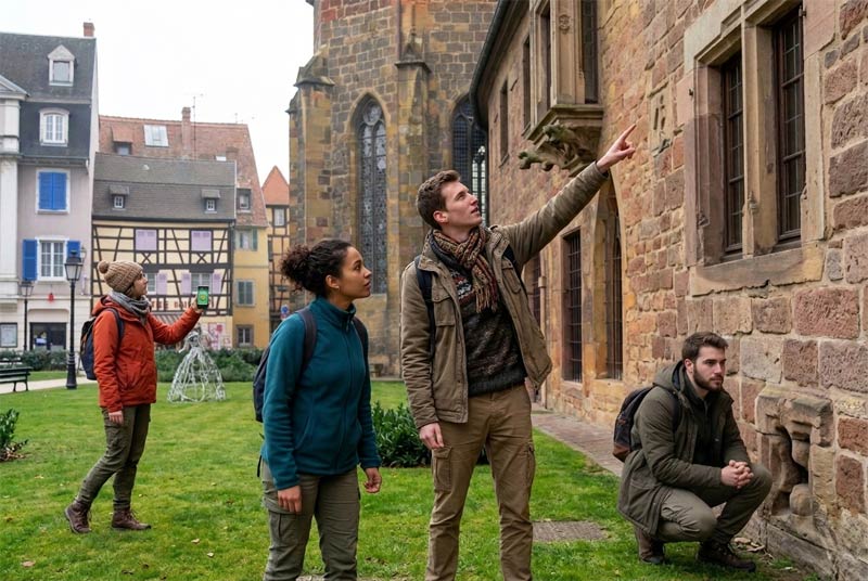 Le terrain de jeu est magnifique : vous naviguerez entre les maisons à colombages colorées du Quartier des Tanneurs, les bords de la Lauch dans la Petite Venise et les environs de la collégiale Saint-Martin. C’est un parcours conçu pour vous faire lever les yeux sur des détails que les passants ne remarquent jamais, comme les enseignes en fer forgé ou les secrets de la Maison des Têtes.